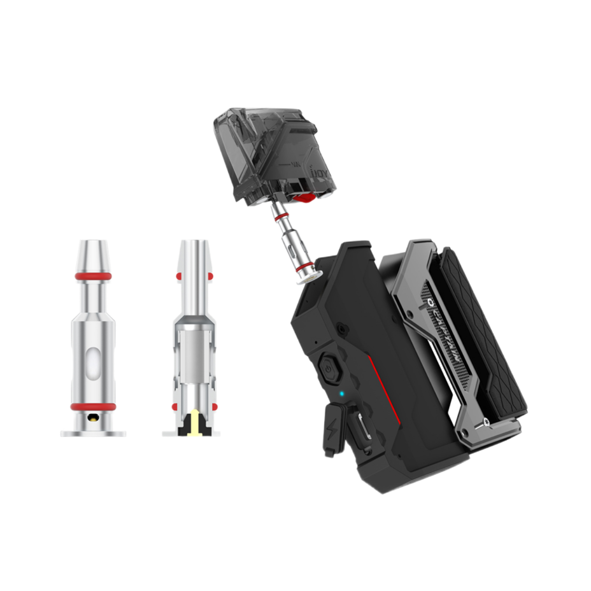 iJoy Captain AirGo Pod – компактная AIO-система, оснащенная аккумулятором средней емкости, оснащенная стабильным чипсетом Univ pro3.0 и рассчитанная на использование сменного испарителя одного сопротивления. Выглядит девайс достаточно оригинально и немного футуристично, причем его размеры достаточно скромные и выглядит он не как под-мод, а как небольшой стильный коробок, но при этом корпус имеет защиту от внешних воздействий класса IP68. Несмотря на наличие чипсета Univ pro3.0, девайс рассчитан на работу на одной мощности 15 Ватт с одним испарителем на сетке сопротивлением 0,8 Ом. Выглядит iJoy Captain AirGo Pod очень оригинально – это далеко не просто небольшой коробок, а настоящее произведение вейп-искусства. Девайс выполнен достаточно оригинально и в некоторой степени футуристично, так как в нем нет традиционных прямых углов и четких линий, зато имеется масса декоративных элементов. Устройство достаточно компактное, по размерам меньше пачки сигарет – 88х50х14 мм, поэтому оно отлично поместиться в карман. Отдельного внимания заслуживает тот факт, что iJoy Captain AirGo Pod выполнен по стандарту IP68, поэтому устройство можно с собой смело брать и на пикник, и на поход на байдарках, и даже в горы. Но все же не стоит тестировать ударопрочность девайса, подкладывая его под колеса КамАЗа. iJoy Captain AirGo Pod рассчитан на работу на одной мощности – 15 Ватт, которая обеспечивается встроенным аккумулятором средней емкости 930 мАч, чего вполне достаточно для автономной работы в течение одного-двух дней. Заряжается аккумулятор при помощи разъема USB Type-C, расположенного на боковой панели и закрытого силиконовой заглушкой, током 1,5А, благодаря которому время зарядки будет занимать около 70-80 минут. Несмотря на то, что iJoy Captain AirGo Pod оснащен достаточно интересным и производительным чипсетом – Univ pro3.0, но в распоряжении вейпера нет особых возможностей, только один режим с мощностью 15 Ватт. При этом нет возможности изменять рабочую мощность, так как на девайсе единственная кнопка – это кнопка «fire», выполняющая еще дополнительно функцию включения. С учетом габаритных особенностей и конструкции IJOY Captain AirGo Pod в нем используется достаточно специфический картридж. Производитель акцентирует внимание на том, что процедуру заправки картриджа можно производить даже одной рукой. Специально для IJOY Captain AirGo Pod был разработан сменный испаритель особенной конструкции на сетке сопротивлением 0,8 Ом. Такой испаритель всего один, но зато он способен удивить вейпера своей вкусопередачей. Регулировка обдува не предусмотрена. Если верить заявлениям производителя, то ресурс испарителя – 16-22 мл жидкости, поэтому особых надежд на его длительный срок эксплуатации полагать не стоит. Для того чтобы заправить картридж, его необходимо вынуть из батарейного блока, перевернуть, открыть силиконовую заглушку на дне и залить 5,5 мл жидкости, причем рекомендуется использовать жидкости на основе солевого никотина.